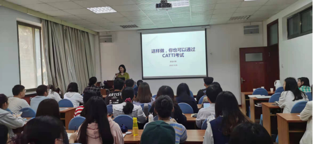 赵忠会主任讲座围绕三个主题:你了解CATTI考试吗、为什么要通过CATTI考试以及如何通过CATTI考试。赵主任首先讲解了CATTI的“前世今生”。CATTI考试全称为全国翻译资格(水平)考试,由中华人民共和国人力资源和社会保障部委托外文局负责实施与管理。举办CATTI考试的重要目的是客观公正地评价翻译人才,引导翻译行业健康发展,建立国家高端翻译人才库。